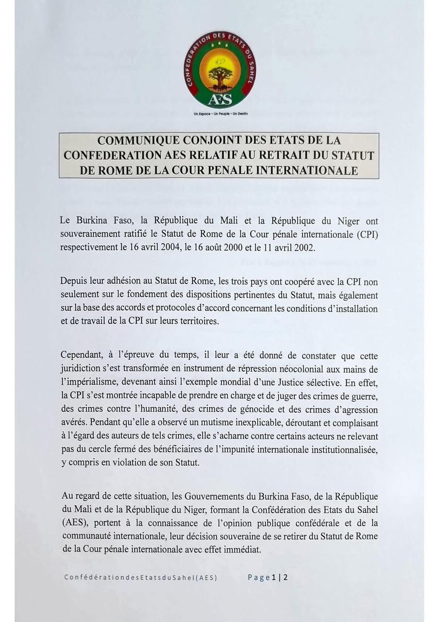 وجاء في بيان مشترك للدول الثلاث، الأعضاء في “تحالف دول الساحل”، أن المحكمة أثبتت عجزها عن التعامل مع جرائم الحرب والجرائم ضد الإنسانية وملاحقة مرتكبيها، واصفين إياها بـ”أداة قمع استعماري جديد”.