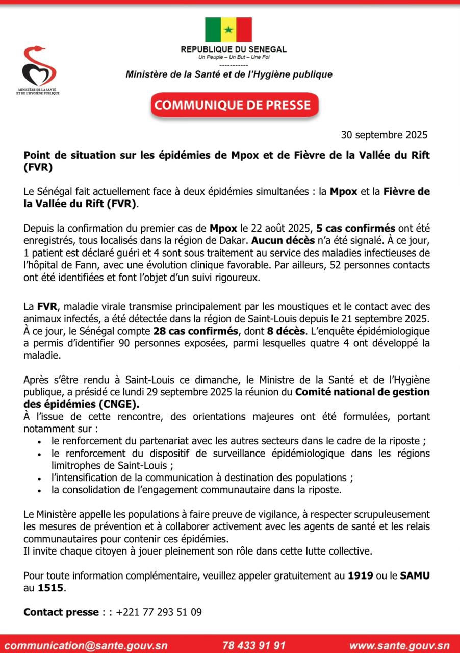 أما بالنسبة لحمى الوادي المتصدع، فقد سجلت 28 إصابة مؤكدة في سان لوي منذ 21 سبتمبر الجاري، نتج عنها 8 وفيات، مع رصد 90 شخصا تظهر عليهم الأعراض.