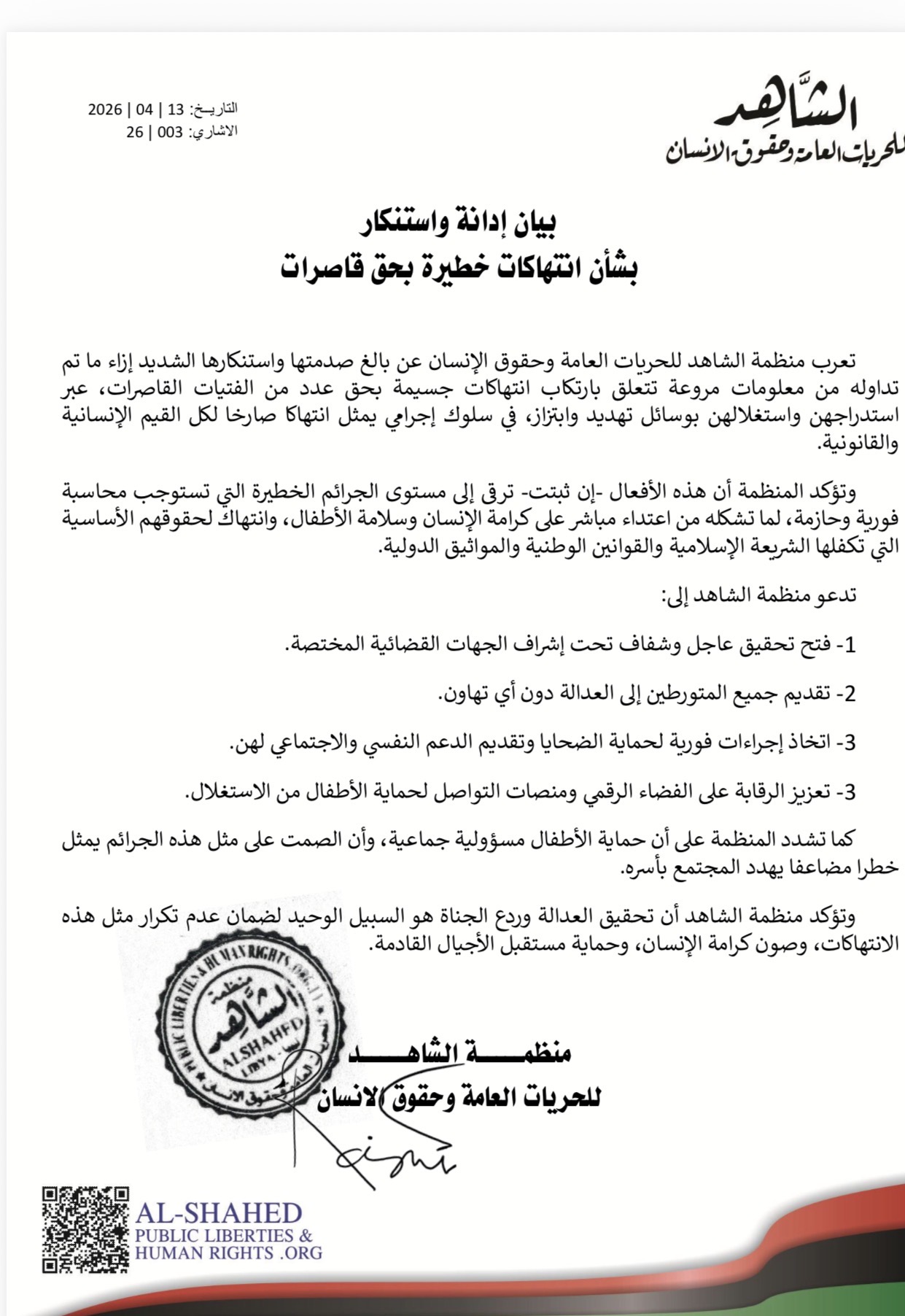 أدانت منظمة الشاهد للحريات العامة وحقوق الإنسان ما وصفته بانتهاكات خطيرة بحق عدد من الفتيات القاصرات، معربة عن صدمتها إزاء تقارير تتحدث عن استدراج واستغلال الضحايا باستخدام التهديد والابتزاز.