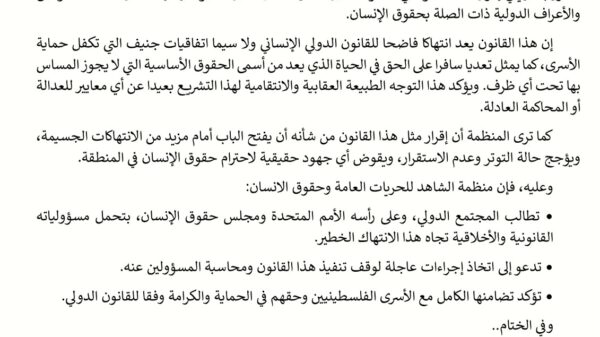أدانت منظمة الشاهد للحريات العامة وحقوق الإنسان إقرار قانون إعدام الأسرى الفلسطينيين، معتبرة أنه يشكل تصعيداً خطيراً وانتهاكاً صارخاً للمواثيق الدولية والقانون الدولي الإنساني....