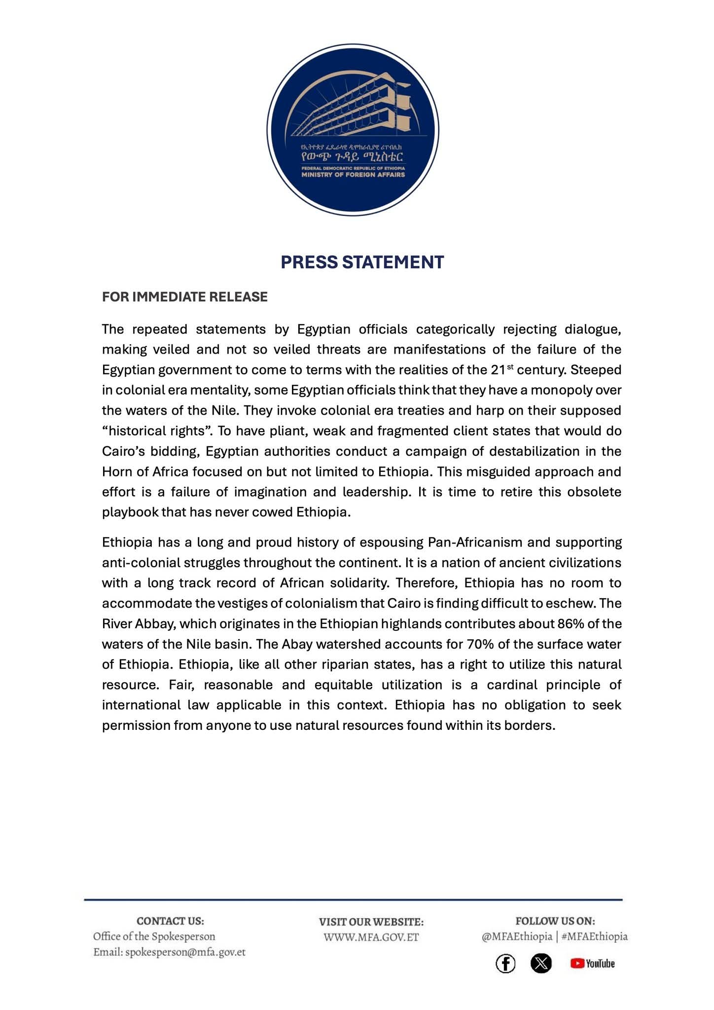 According to the statement, repeated remarks by Egyptian officials reflect a belief in an “exclusive right” to Nile waters based on “outdated treaties” and “baseless historical claims.” The ministry also accused Cairo of rejecting dialogue and resorting to direct and indirect threats.