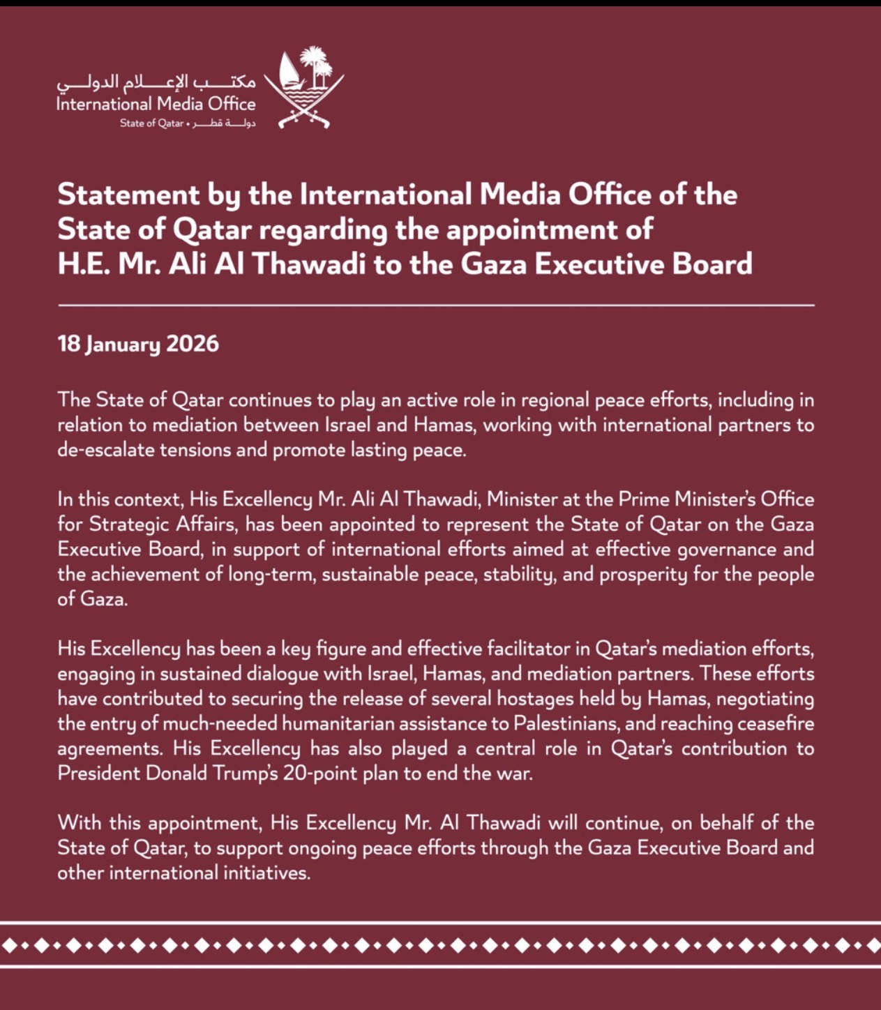 Le Qatar a annoncé la nomination d’Ali Al-Thawadi, ministre des Affaires stratégiques au bureau du Premier ministre, comme représentant du pays au sein du conseil exécutif de Gaza, une décision qui reflète la poursuite du rôle actif de Doha dans les efforts de médiation régionaux et internationaux visant à réduire les tensions et à parvenir à une paix durable.